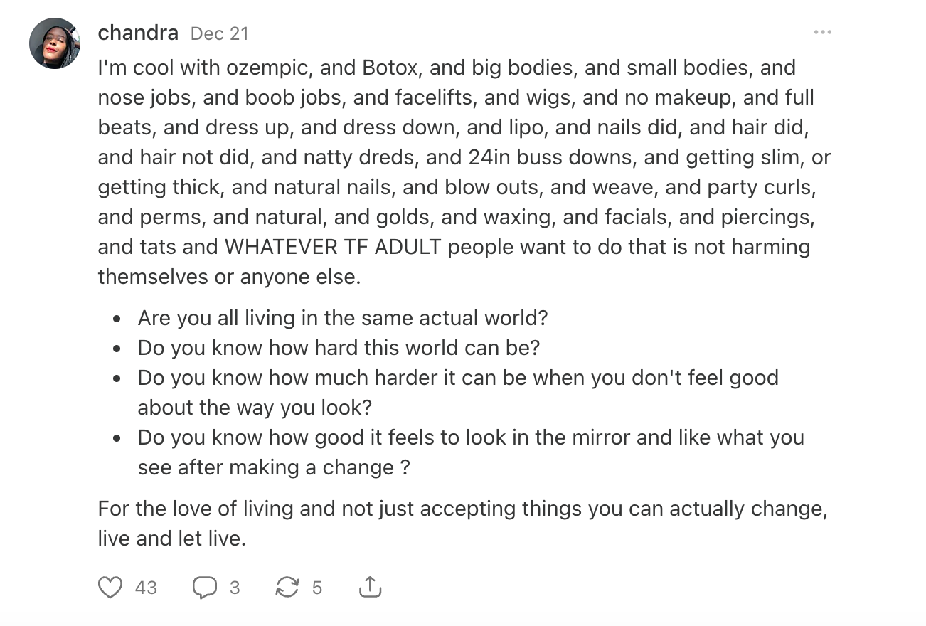 Hi darlings. I’m back, and by back, I mean my opinionated takes and perspectives from a perfect life imperfectly lived are back. Speaking of perfection, my coworkers and I had a lunch conversation about red light masks, which led to a more general chat about beauty. My take, as you might remember, is that I put all beauty enhancement in the same category.
